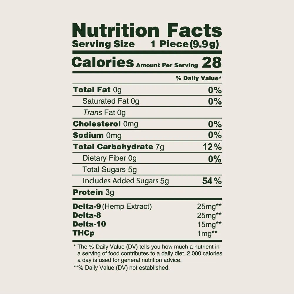 This gummy delivers a precise blend of cannabinoids for a multidimensional experience. It includes 25mg Delta-9 THC for a classic euphoric lift, 25mg Delta-8 THC for a smoother, milder ride, and 15mg Delta-10 THC to enhance clarity with a gentle uplift. A potent 1mg of THCp rounds out the formula, intensifying sensory effects and deepening the overall high. Together, they create a powerful and balanced experience tailored to elevate your Mood.