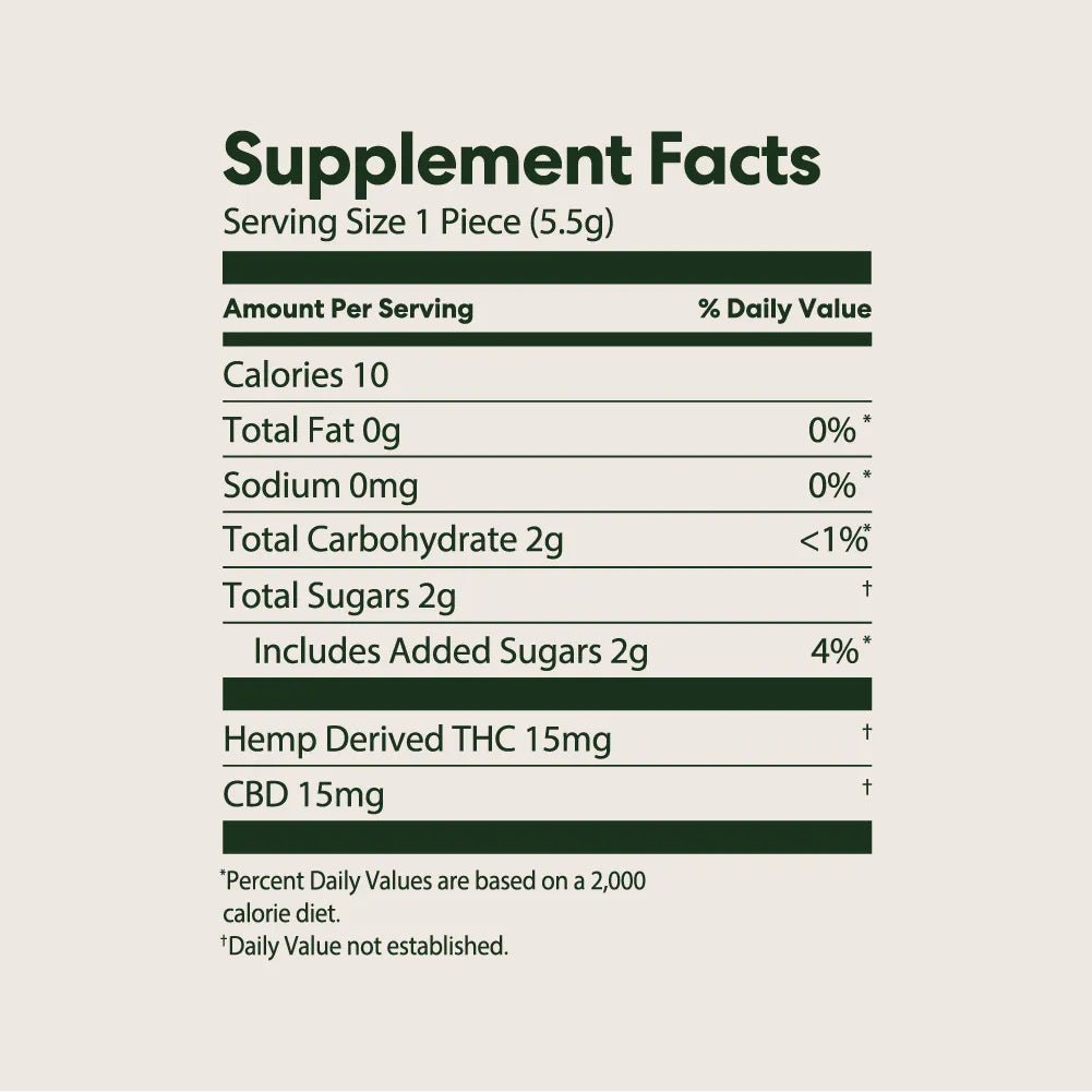 Each gummy combines 15mg of CBD and 15mg of Delta-9 THC to deliver a well-rounded, enjoyable experience. The CBD works to relax the body, calm the mind, and ease away daily stressors, while the Delta-9 THC uplifts the mood and promotes a sense of positivity and euphoria. Together, they create a balanced high that soothes without overwhelming—ideal for unwinding, recharging, or simply enhancing your vibe.