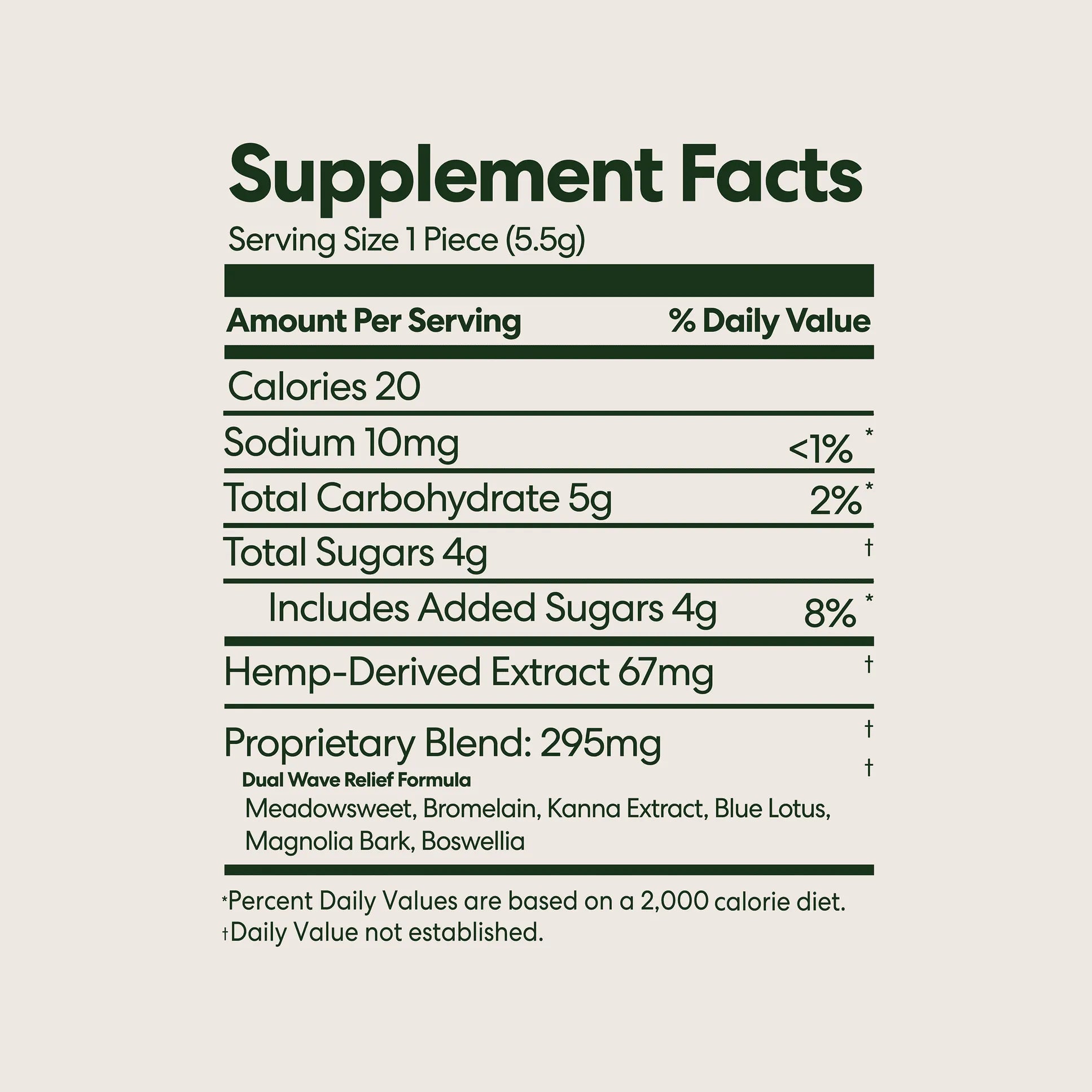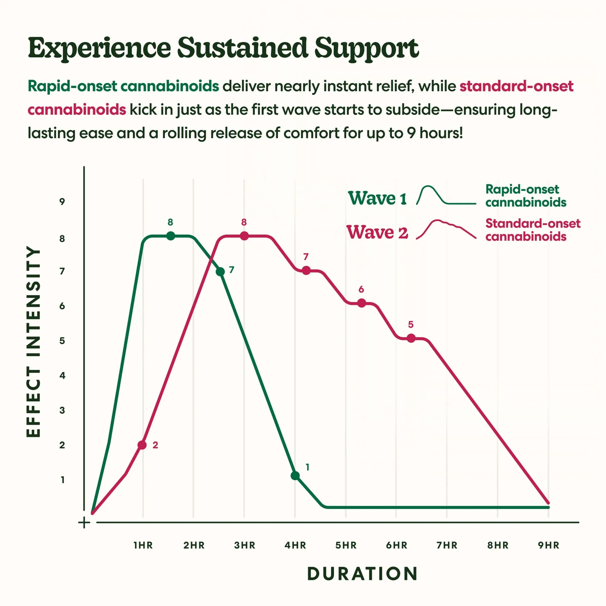 • Dual-Wave Relief combines both fast-acting and sustained-release Delta-9 THC, giving you quick comfort followed by lasting, full-body relief.