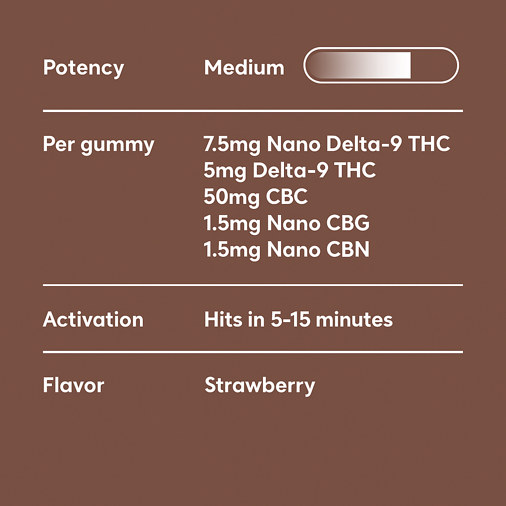 This formula blends 7.5mg fast-acting and 5mg standard Delta-9 THC for a quick, uplifting buzz. It’s balanced with 1.5mg each of CBN, CBG, and CBC to support relaxation, focus, and mood. Plus, 50mg of CBD helps ease stress without the high.