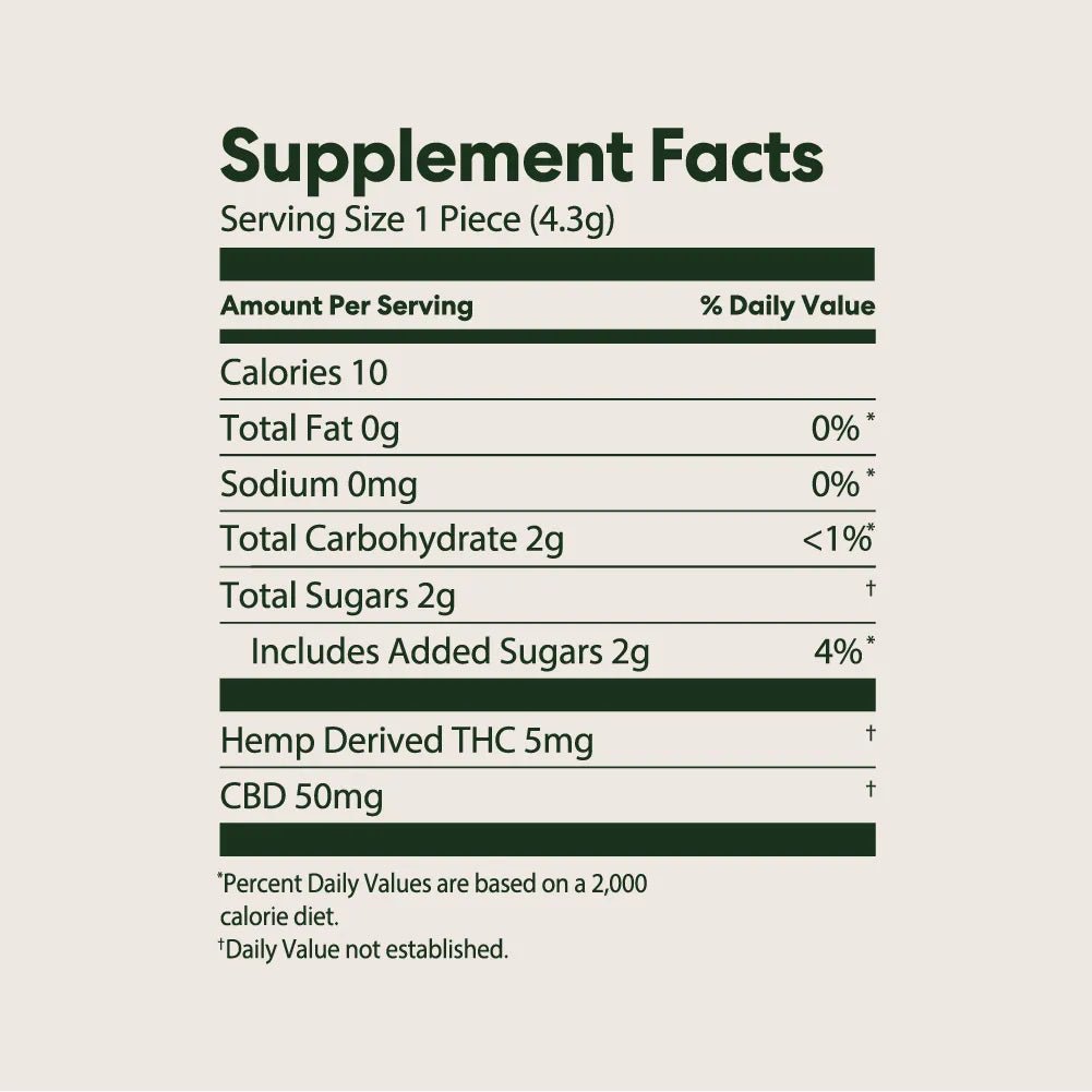 • CBD helps balance the effects of THC, reducing any potential anxiety while boosting relaxation. Together, the 5mg THC and 50mg CBD create a smooth, mellow experience for both body and mind.